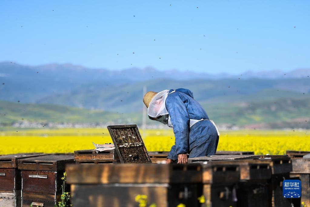 進(jìn)入七月,位于青海省海北藏族自治州門源回族自治縣的萬(wàn)畝油菜花競(jìng)相綻放。來(lái)自四川德陽(yáng)的蜂農(nóng)馮躍宣在花海里忙碌。他從早上7點(diǎn)開始整理蜂箱、采集花粉、晾曬花粉,一直忙碌到晚上8點(diǎn)。