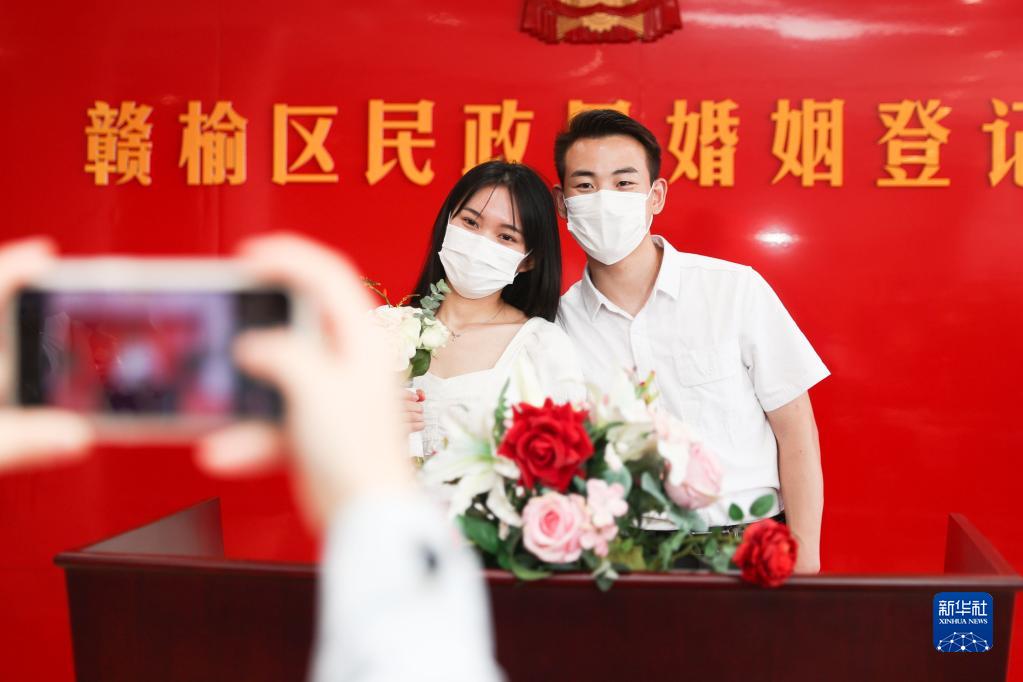 8月4日,在江蘇省連云港市贛榆區(qū)民政局婚姻登記處,一對新人領(lǐng)取結(jié)婚證后拍照留念。