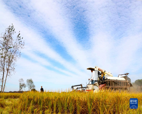10月10日,在湖南省衡陽(yáng)市祁東縣河洲鎮(zhèn),農(nóng)機(jī)手駕駛農(nóng)機(jī)在收割稻谷。