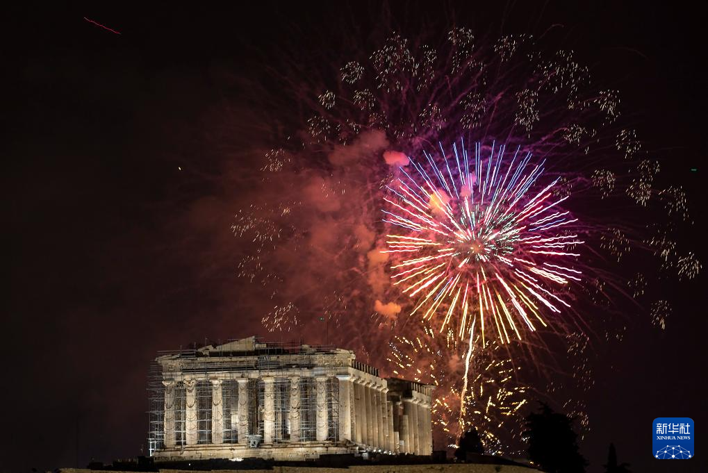 2024年1月1日凌晨,在希臘雅典舉行的迎接新年慶?;顒?dòng)中,焰火照亮雅典衛(wèi)城。