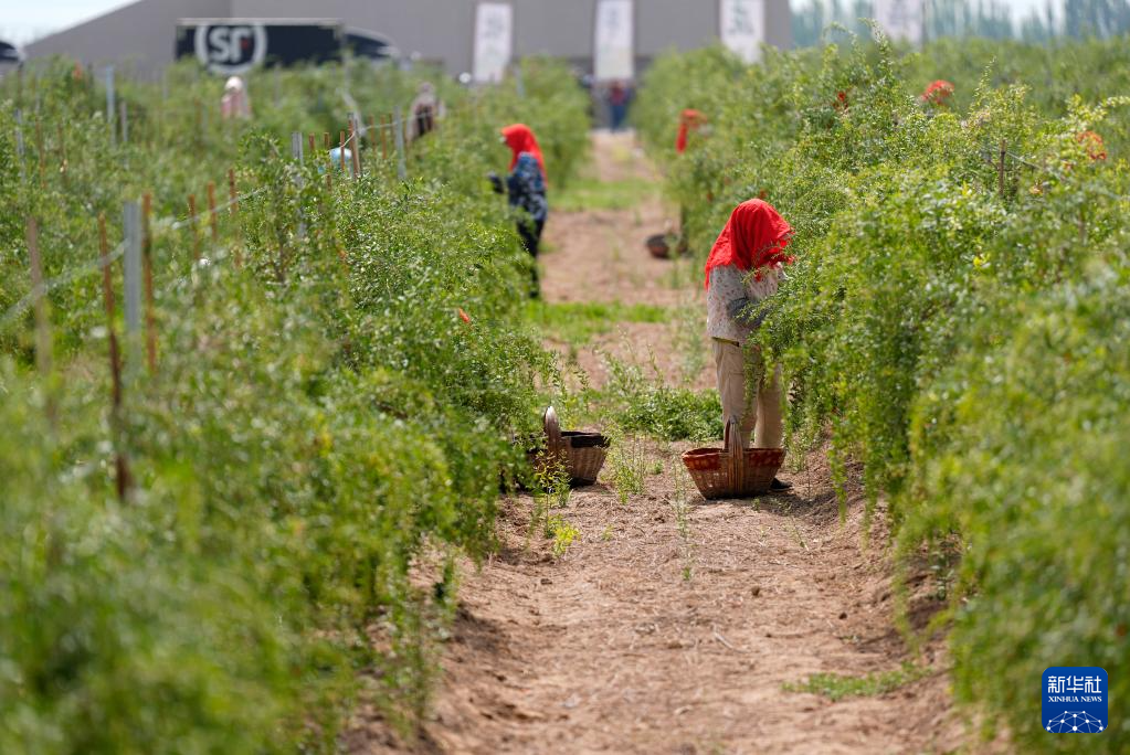 6月12日,采摘工在枸杞地里采摘枸杞。