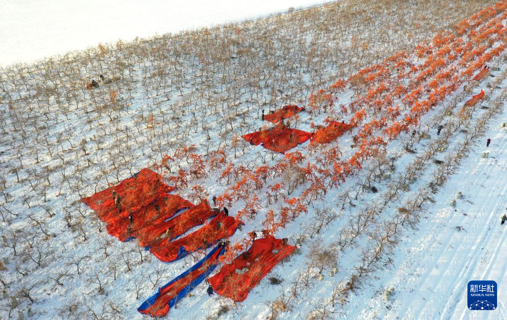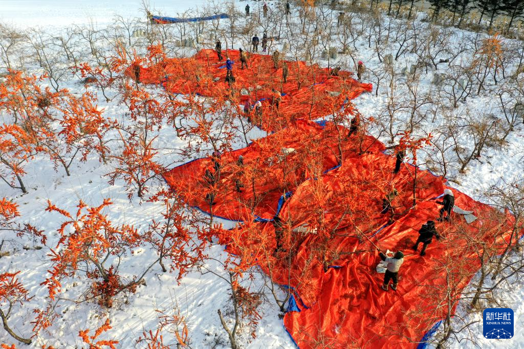 12月16日,黑龍江北大荒農(nóng)業(yè)股份有限公司友誼分公司的種植戶在采收沙棘果(無(wú)人機(jī)照片)。