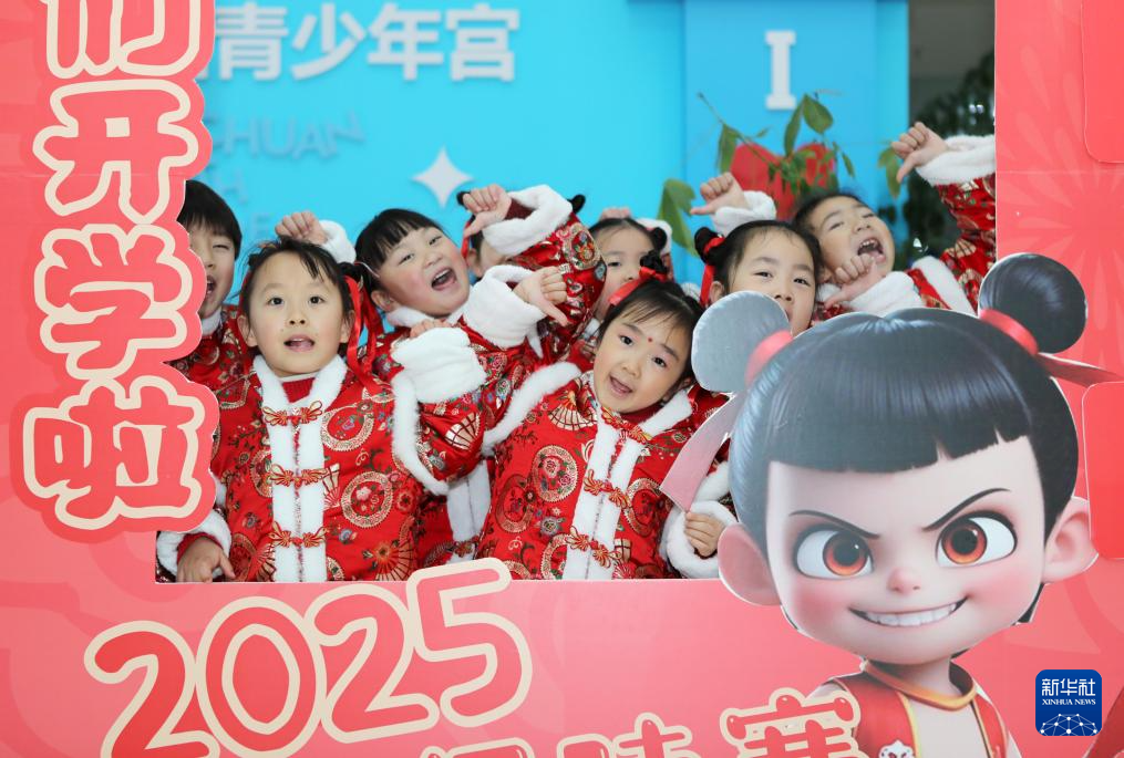 2月23日,在重慶市永川區(qū)青少年活動中心,孩子們與哪吒卡通形象合影。