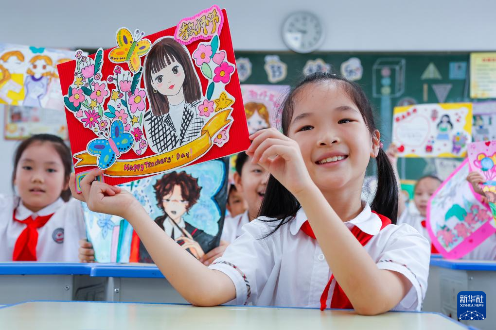 9月9日,在江蘇省句容市實驗小學(xué),學(xué)生展示手工制作的教師節(jié)賀卡。